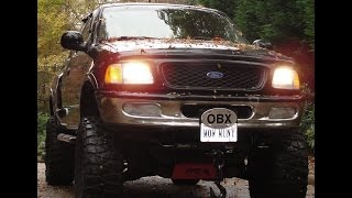 OMG! JACKED UP MUD TRUCK CAB RIDE ~ INSANE TIRE NOISE AND CRAZY EXHAUST ~37 INCH MUDDERS, First, sorry about the shaky camera.My NO-PRO HAND-HELD is not very stable! This is my Ford F-150. The tires are 37/13.5/17. I just installed a nice 5.4 engine after having trouble with the old one that had 300,000 miles. Someone had ruined the aluminum head by stripping out one of the spark plug holes beyond repair. I got the exhaust tone by taking off 2 of the 4 CATS that were on it and installing a 2-chamber Flow Master with 3 inch pipes and long 4 inch tips. I love this truck. OH, THE TIRES ARE NITTO MUD GRABBERS EXTREME TERRAIN AND THE WHEELS ARE AMERICAN RACING ATX SERIES..